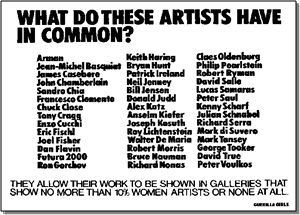 »Yhä uusia kiusallisia julisteita ilmaantuu satojen muiden viestien joukkoon New Yorkin Sohon ja Tribecan kaupunginosien seinille, galleriasta toiseen kiertävän taideyleisön kulkureitille. Ironiset tekstit ja kiistämättömän todenmukaiset tilastot muistuttavat ohikulkijoita yhdysvaltalaisen taidekoneiston sitkeästä seksismistä ja rasismista. Allekirjoittajana on anonyymeinä pysyttelevien naisten yhteisö Guerilla Girls, joka turhia kainostelematta on nimennyt itsensä ›taidemaailman omaksitunnoksi›.»