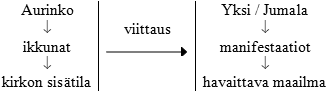 Auringon, ikkunoiden ja sisätilan muodostama rakenne viittaa tai vihjaa, että maailma kokonaisuudessaan on rakentunut samaan tapaan. Kirkkorakennuksen tehtävä on tarjota tila jumalanpalveluksen pitämiseksi; ikkunan tehtävä on päästää valoa sisätilaan. Mutta ikkunat yhdessä sisätilan kanssa toimivat myös merkkinä tai symbolina.