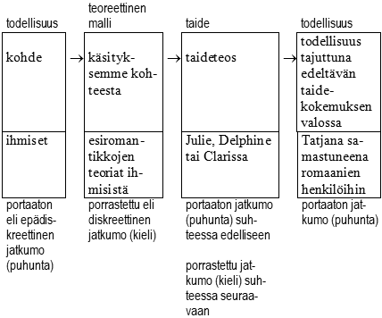 Julie on päähenkilö Rousseaun romaanissa Julie ou la nouvelle Heloïse (1761). Delphine on päähenkilö Mme de Staëlin romaanissa Delphine (1802). Clarissa on päähenkilö Richardsonin kirjeromaanissa Clarissa Harlowe (1747–1748).