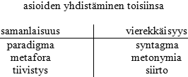Saussure: Cours de linguistique générale, s. 33 / Course in General Linguistics, s. 16. Olen käyttänyt siellä missä mahdollista hyväkseni niitä suomennoksia, joita Risto Heiskala on kääntänyt Jonathan Cullerin kirjaan Ferdinand de Saussure.