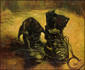 Heidegger: Taideteoksen alkuperä, s. 31–32. Alkukielellä: »Aus der dunklen Öffnung des ausgetretenen Inwendigen des Schuhzeuges starrt die Mühsal der Arbeitsschritte. In der derbgediegenen Schwere des Schuhzeuges ist aufgestaut die Zähigkeit des langsamen Ganges durch die weithin gestreckten und immer gleichen Furchen des Ackers, über dem ein rauher Wind steht. Auf dem Leder liegt das Feuchte und Satte des Bodens. Unter den Sohlen schiebt sich hin die Einsamkeit des Feldweges durch den sinkenden Abend. In dem Schuhzeug schwingt der verschwiegene Zuruf der Erde, ihr stilles Verschenken des reifenden Korns und ihr unerklärtes Sichversagen in der öden Brache des winterlichen Feldes. Durch dieses Zeug zieht das klaglose Bangen um die Sicherheit des Brotes, die wortlose Freude des Wiederüberstehens der Not, das Beben in der Ankunft der Geburt und das Zittern in der Umdrohung des Todes. Zur Erde gehört dieses Zeug und in der Welt der Bäuerin ist es behütet. Aus diesem behüteten Zugehören ersteht das Zeug selbst zu seinem Insichruhen.» <Holzwege, s. 19.>